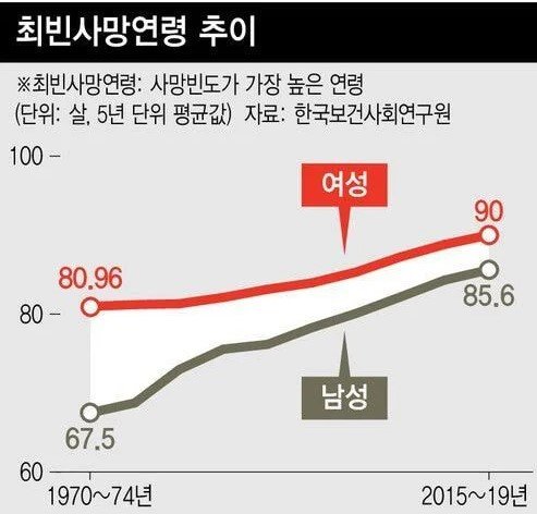 인구대비 사망률이 가장 높은 나이대를 의미하는 단어임. 남성의 최빈사망연령은 86.5세이며 여성의 최빈사망연령은 91세로 추정됨. 전세계 국가들중 여성의 최빈사망연령이 90세를 넘긴 국가가 단 두곳 있는데 한국, 일본이라고 함