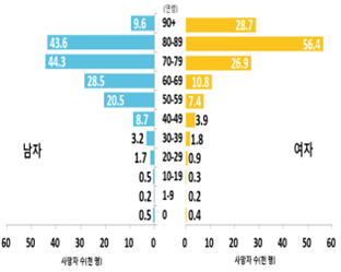 등 사망자 인구가 나이에 따라 꾸준히 증가하는 경향을 보이다가 85세 이후부터는 사망자 인구가 감소하는 경향이 있음