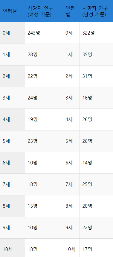 이런 이유로 현재 통계상 해마다 나이대에 따른 사망자 통계를 찾아봄. 2023년 통계는 아직 발표되지 않아서 제작년인 2022년 기준 통계자료임