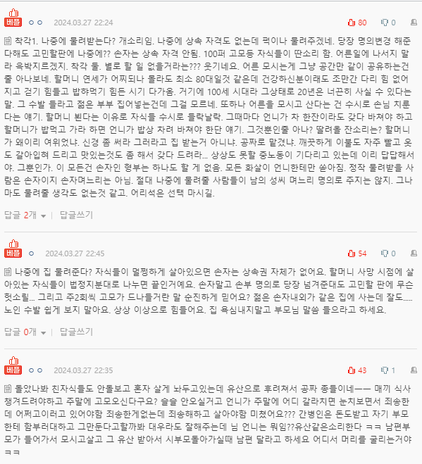 형부네 할머니모시고 살면 어떻겠냐고 이야기가 나왔대요. 나중에 그 집은 형부가 온전히 물려받고...