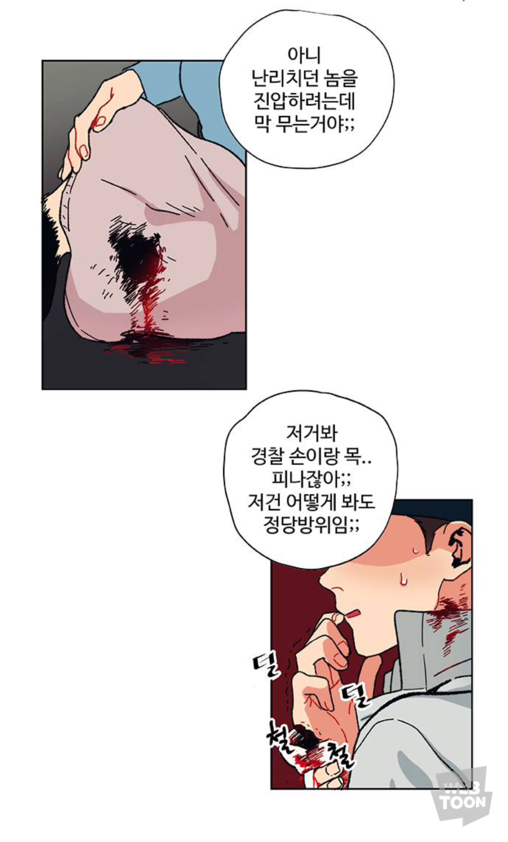 피해 입은 경찰이 유독 더 떠는 것 처럼 보인다.
