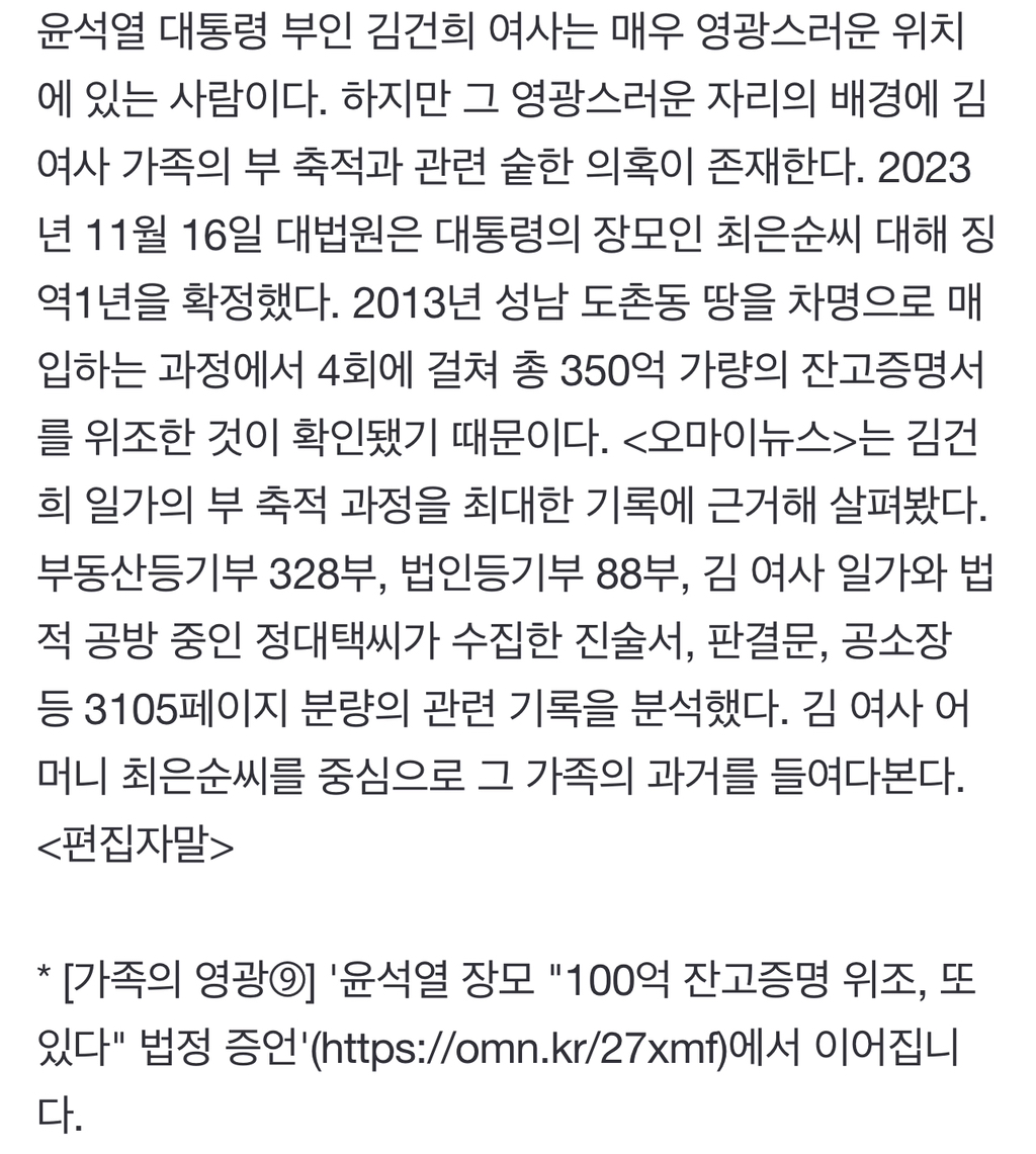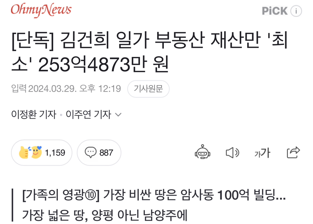 [여시뉴스데스크][단독] 김건희 일가 부동산 재산만 '최소' 253억4873만 원 작성자아, 죽어|작성시간24.03.29|조회수2,035 목록 댓글 12 글자크기 작게가 글자크기 크게가 출처: https://n.news.naver.com/article/047/0002428034?sid=101[단독] 김건희 일가 부동산 재산만 '최소' 253억4873만 원윤석열 대통령 부인 김건희 여사는 매우 영광스러운 위치에 있는 사람이다. 하지만 그 영광스러운 자리의 배경에 김 여사 가족의 부 축적과 관련 숱한 의혹이 존재한다. 2023년 11월 16일 대법원은n.news.naver.com 다음검색 현재 게시글 추가 기능 열기 북마크 공유하기 신고 센터로 신고 댓글 댓글 12 댓글쓰기 답글쓰기 댓글 리스트 작성자좋은일가득 | 작성시간 24.03.29 돈 존나 많네 ㅋㅋㅋ 사는 게 추하고 남들한테 욕처먹어도 돈에 미치면 다 상관없나 보다 개싫다 정말 작성자0000132 | 작성시간 24.03.29 차명계좌지ㅋㅋㅋ참 작성자루닐 웨즐립 | 작성시간 24.03.29 박탈감무새들어디갓노 작성자쿸희 | 작성시간 24.03.30 최소 시발 작성자독도지켜 | 작성시간 24.03.30 도둑질 댓글 전체보기