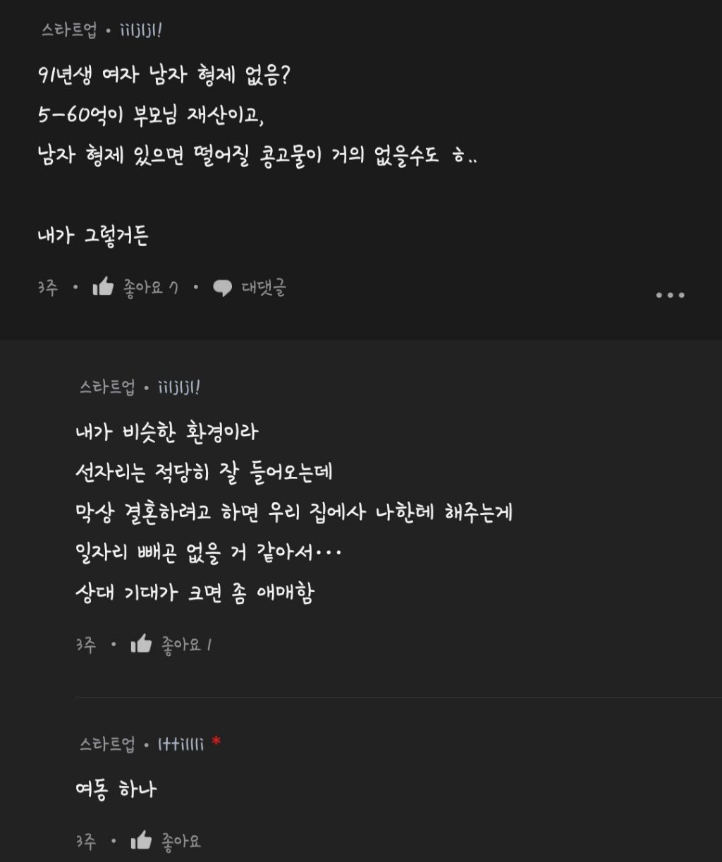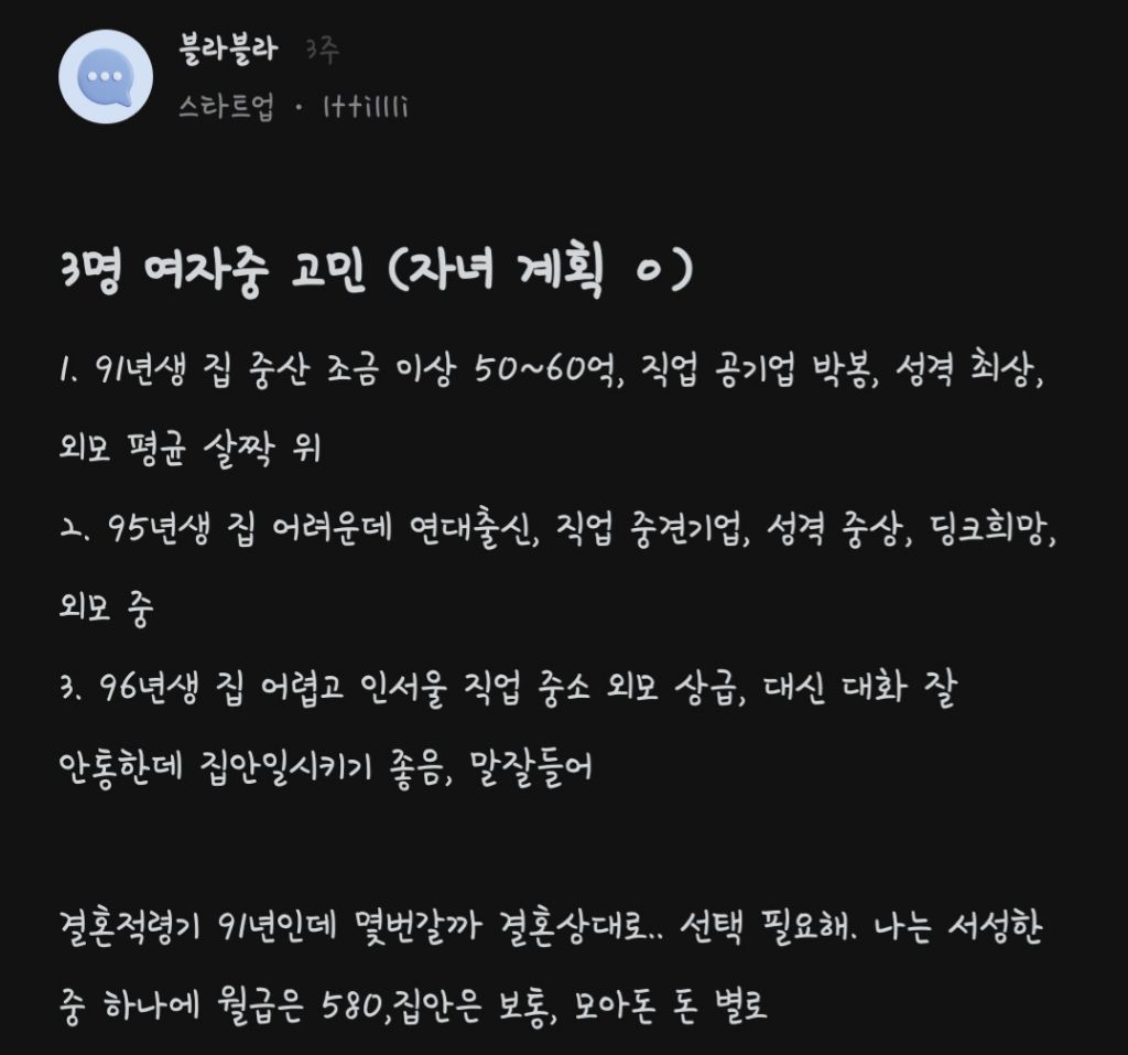 [흥미돋]블라)집안일 시키기 좋은 여자와 집안좋은 여자 중 고민하는 남자 작성자샷샷샤샤|작성시간24.03.30|조회수36,630 목록 댓글 144 글자크기 작게가 글자크기 크게가 출처: [Blind] 3명 여자중 고민 (블라블라)https://www.teamblind.com/kr/s/1XcyiC3x 다음검색 현재 게시글 추가 기능 열기 북마크 공유하기 신고 센터로 신고 댓글 댓글 144 댓글쓰기 답글쓰기 댓글 리스트 작성자신발지네 | 작성시간 24.03.30 자아 존나비대 ㅋㅋ 답댓글 작성자어의동 | 작성시간 24.03.31 2222222 작성자그날비와라 | 작성시간 24.03.30 아무도 안만나줄거같은데 작성자정량 | 작성시간 24.04.01 해준대..? 작성자possibility | 작성시간 24.04.01 미친새낀가 댓글 전체보기