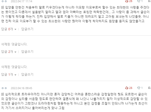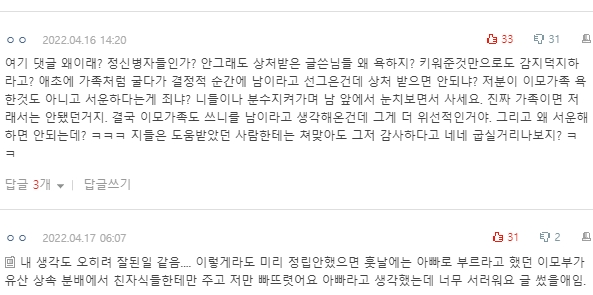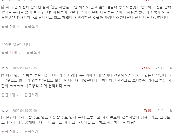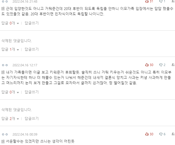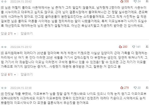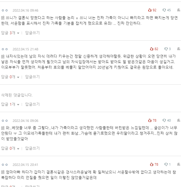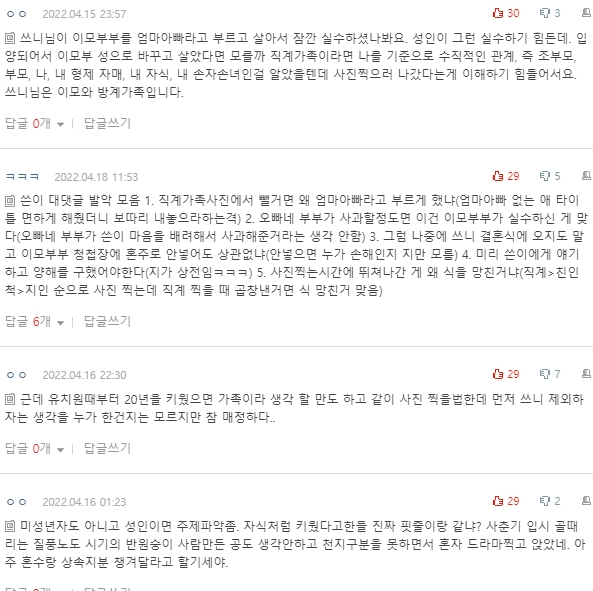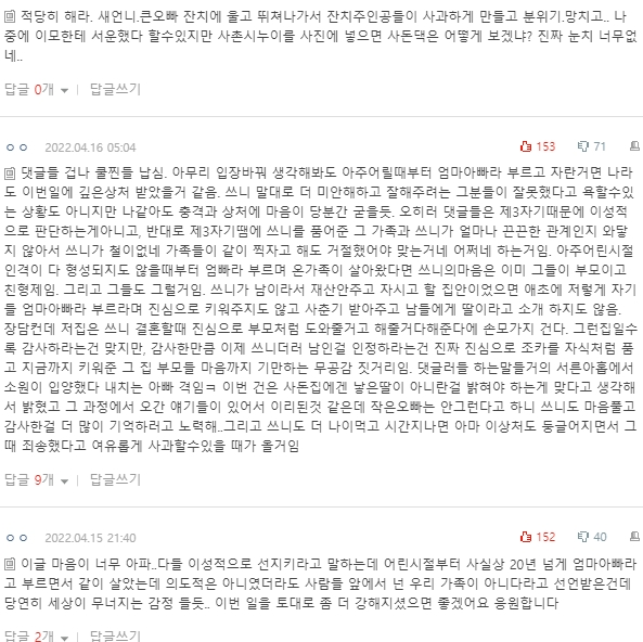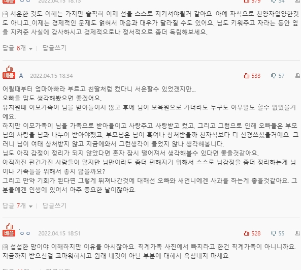 작성자키듀키듁 작성시간 24.04.01 드라마 일타스캔들에서 해이가 이런경우 아닌가.. 이모부부는 정말 글쓴이 생각해서 엄마아삐라고 부르라고 한 거일텐데 이걸로 이모부부가 비난을 받는거면 글쓴이 학창시절에 받을 상처 이런거 다 무시하고 이모라고 부르라고 했어야 했나 싶은데. 이모부부가 굳이 잘못한게 있다면 성인이 된 후에는 글쓴이와 진지하게 독립에 대해 이야기 했아야 했는데 그러지 못한거고 사촌오빠도 본인은 친동생으로 받아들이지 못 해서 순간적으로 빠지라고 한 것 같음.. 사촌오빠도 나름대로 상처받은 부분, 손해본 부분 있었을 꺼고 이에 대해 사과했으니 더이상 제3자가 왈가왈부 할 사안은 아니라고 생각.. 글쓴이 당연히 서운하겠지만 가족들도 다 사과했고 앞으로 정서적으로 독립하는 시간을 가지는게 필요해보여ㅠ 타이밍이 좋지 않았지만 언젠가는 필요한 시간이었고 결론적으로 친자식 처럼 키워준거지 친자식으로 받아드린건 아니니까. 솔직히 글쓴이는 가족이라고 생각했ㄴ는데 사촌오빠들은 그저 사촌동생이라고 생각하고 이모부부조차 입양을 안 한 데서 친자식 삼을 생각은 없었던 거니까 어떤 방식으로든 상처받을 수 밖에 없는 간극이 있었던 것 같아.. 그냥 마음 잘 추스르기를 바랄뿐…