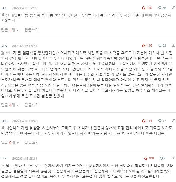 작성자나의 바다 작성시간 24.04.01 그까짓 사진 걍 같이 좀 찍으면 뭔 일 남....? 결혼식 직계가족 사진 찍기 전에 뭐 유전자 검사라도 하냐곸ㅋㅋㅋ 가족의 형태는 다양하고 그냥 그 가족은 그런 거지. 천애고아 거둬 키워서 가족사진 같이 찍은게 뭔 사돈댁에 흠이 된다고