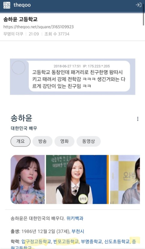 특히 한 네티즌이 6년 전 "고등학교 동창인데 패거리로 친구 한 명 왕따 시키고 때려서 강제전학 갔다. 생긴 것과 다르게 강단이 있는 친구"라며 송하윤의 학창시절을 아는 듯한 댓글을 달아 화제를 모으기도 했다.