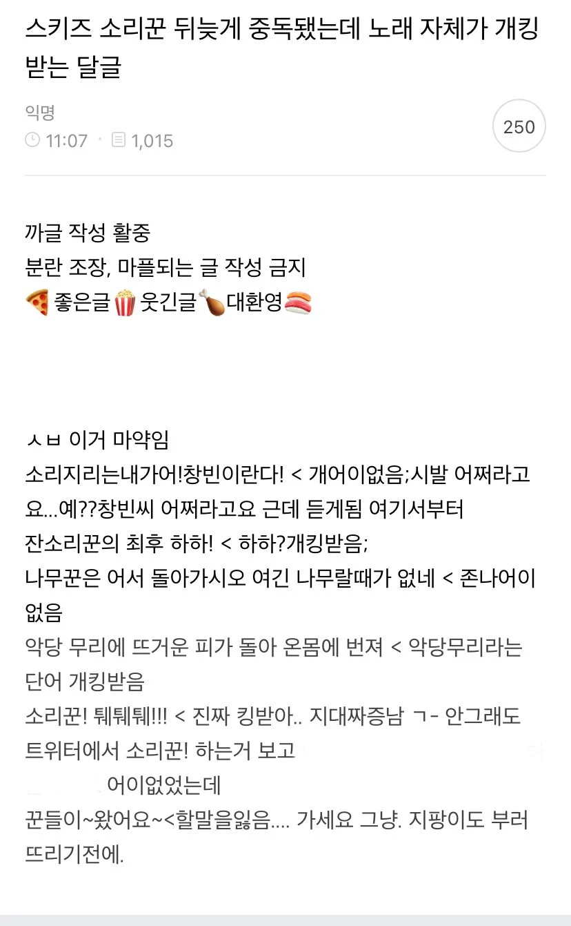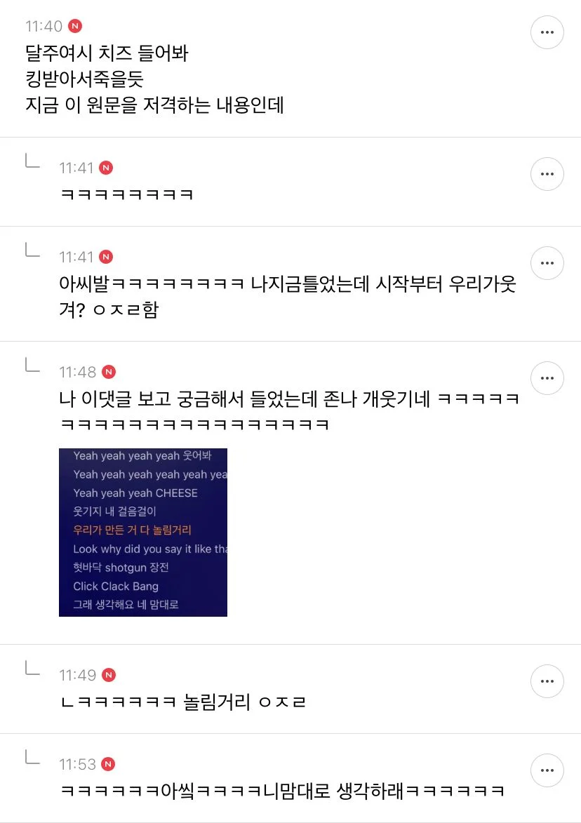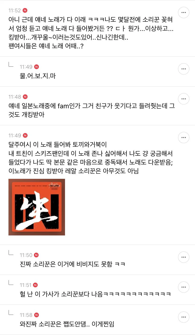 작성자손끝만 작성시간 24.04.03 아 ㅁㅈ 이 노래 뮤비가 개쩔고 비트도 개쩌는데 가사가 킹받아 ㅋㅋㅋㅋㅋㅋㅋㅋㅋ 특 < 이것도 비슷함