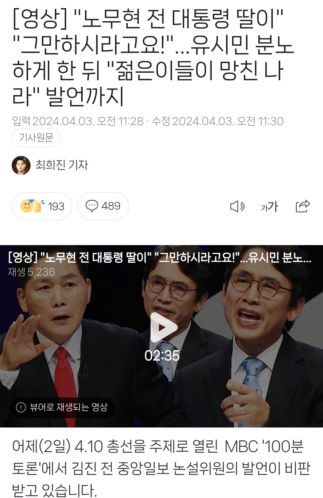 [여시뉴스데스크][영상] "노무현 전 대통령 딸이" "그만하시라고요!"...유시민 분노하게 한 뒤 "젊은이들이 망친 나라" 발언까지