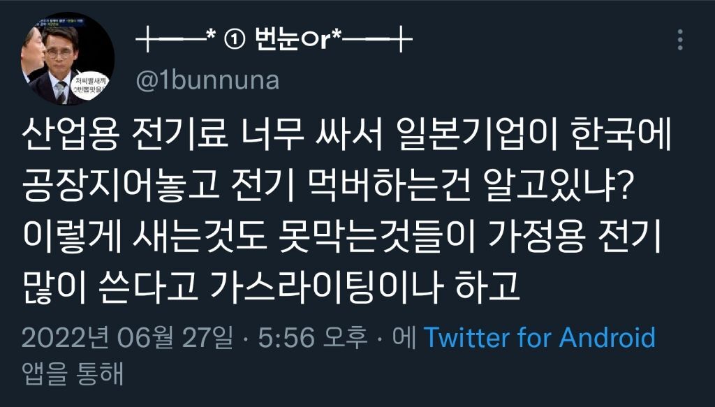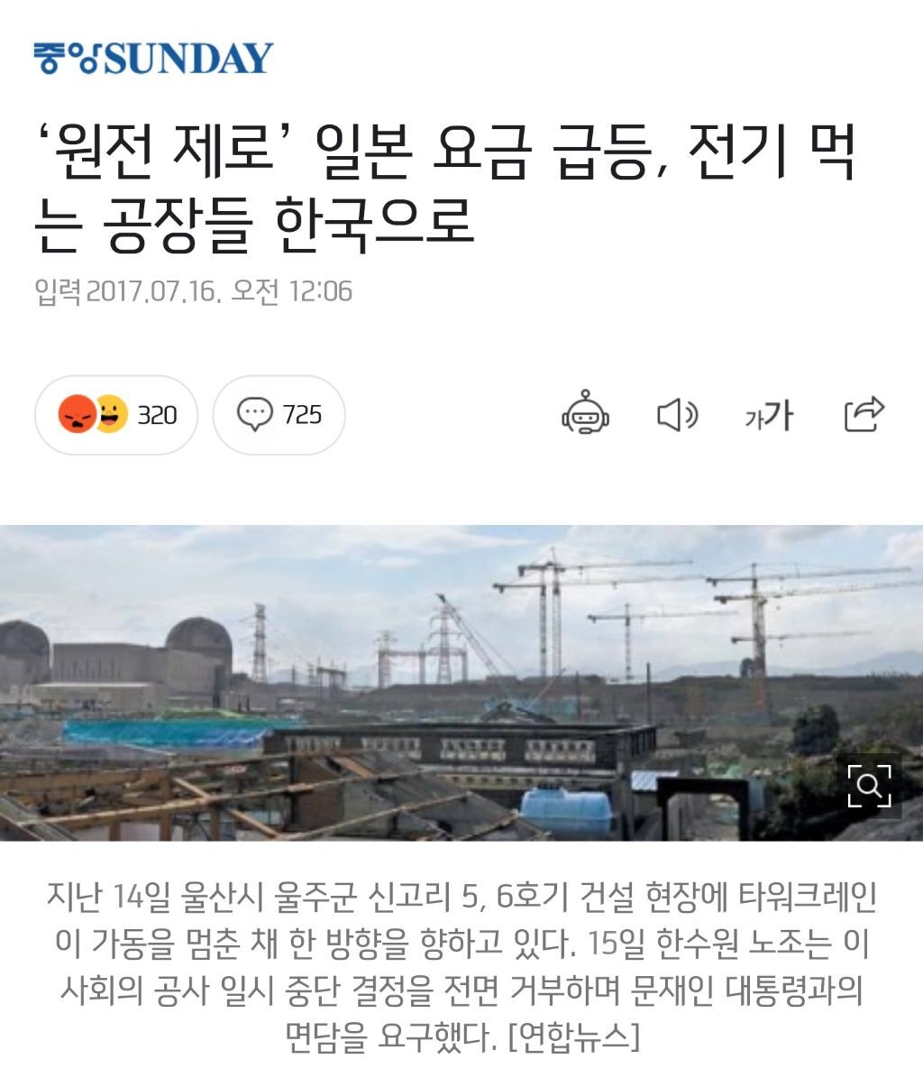 [스크랩] [흥미돋]한국 산업용 전기료 너무 싸서 일본 기업이 공장지어서 전기 먹버하는건 알고 있냐?.twt 작성자노 민영|작성시간24.04.03|조회수2,215 목록 댓글 7 글자크기 작게가 글자크기 크게가 출처 : 여성시대 타인을베려하는마음http://naver.me/xHilnbgN‘원전 제로’ 일본 요금 급등, 전기 먹는 공장들 한국으로지난 14일 울산시 울주군 신고리 5, 6호기 건설 현장에 타워크레인이 가동을 멈춘 채 한 방향을 향하고 있다. 15일 한수원 노조는 이사회의 공사 일시 중단 결정을 전면 거부하며 문재인 대통령과n.news.naver.comhttps://twitter.com/1bunnuna/status/1541347455563796481?t=q8JQ8imuy9AXSYnFR9_PHw&s=19트위터에서 즐기는 ┼━─* ① 번눈ㅇr*─━┼“2017년 기사라 기업수는 달라졌을 수 있지만 일본 민영화 전기료 때문에 한국으로 전기쓰로 피난온 일본기업이 이렇게 많습니다.”twitter.com 다음검색 스크랩 원문 : *여성시대* 차분한 20대들의 알흠다운 공간 현재 게시글 추가 기능 열기 북마크 공유하기 신고 센터로 신고 댓글 댓글 7 댓글쓰기 답글쓰기 댓글 리스트 작성자나만쫌쫌따리 | 작성시간 24.04.03 ㅅㅂㅅㅂ 작성자미친세상아 | 작성시간 24.04.03 미친 작성자2024년 로또 1등 최고 금액 당첨자 | 작성시간 24.04.03 산업용 전기료 좀 어케해봐.. 하다못해 외국공장이라도 패널티를 좀 주든가 해야지ㅠ 작성자빙수향기 | 작성시간 24.04.03 혈압올라 미쳤나 진짜... 작성자강동원참치참치 | 작성시간 24.04.03 하 진짜 음침한 일본놈들 ㅡㅡ 댓글 전체보기