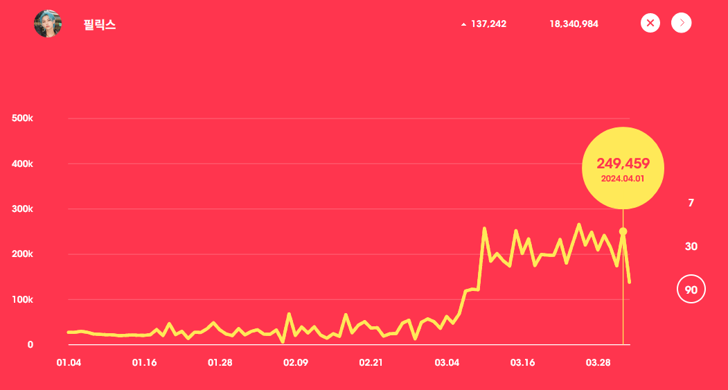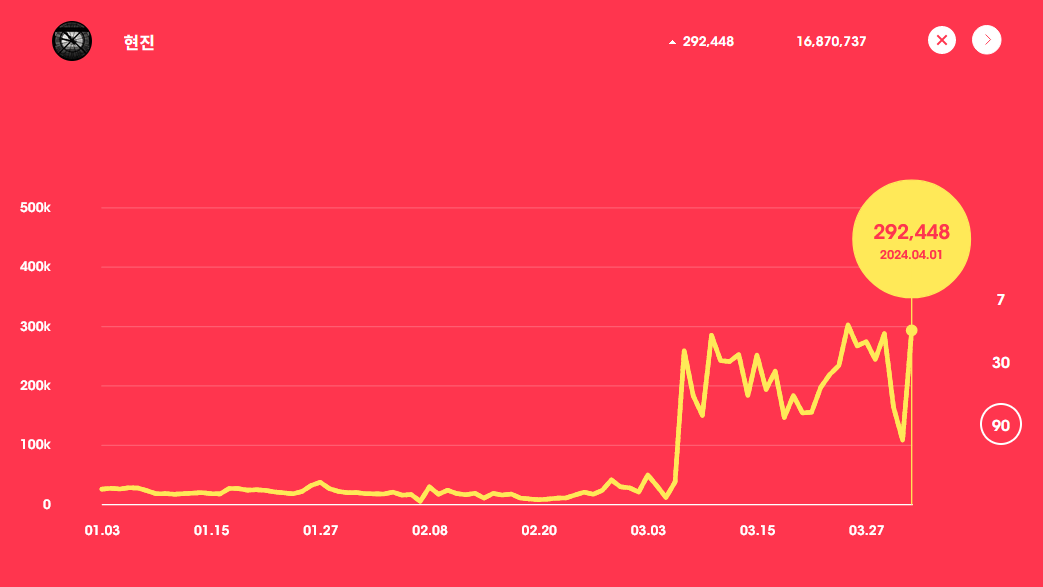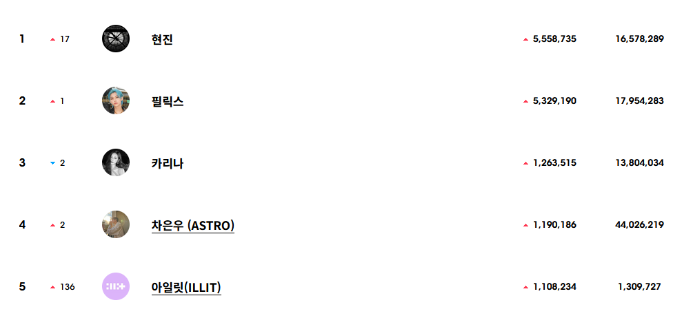 원래 필릭스가 처음부터 계속 제일 높았고 추이도 정상이었는데 패윜 끝나고 반응 좋아서 팔로워 많이 오르니까 현진 쪽이 갑자기 팔로워 사기 시작해서 200만 가까이 차이나던걸 엄청 근소하게 좁힘. 17위에서 순위 확 오른거 보면 알 수 있음. 필릭스 팬들이 질세라 사기 시작해서 다시 차이 벌리는 중