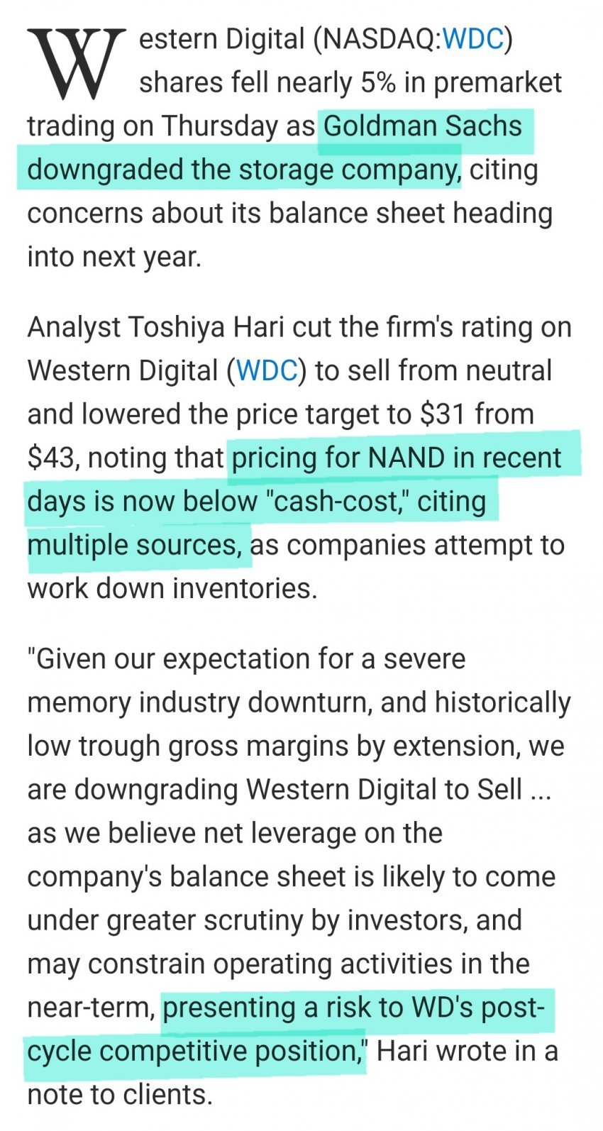 위에 나온 지난 달 골드만삭스 리포트에서 WD를 매도 의견으로 내렸는데, WD가 이제 낸드 사업이 Cash Cost 밑으로 내려가서 EBITDA마저 적자 전환할 것이라고 봤거든. (반면 6조 적자 감안해도 하이닉스의 23년 EBITDA는 9조 원 수준임) 그래서 그날 WD 주가가 거의 15% 가까이 개폭락했었음.