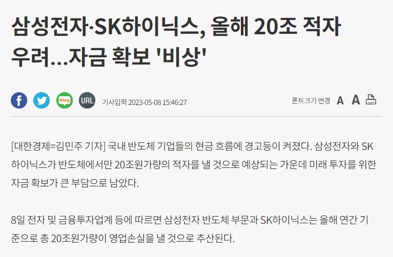 가장 최근자 가이던스 기준으로 하닉은 올해 MAX 12조 원 정도 영업적자가 날 것 같음. 1분기에만 적자 4조 원 예상에 블라 반도체 라운지에서 하닉 무급휴직 소문도 돌고 분위기가 흉흉했었는데, 아주 지나치게 과장된 소문으로 보임.