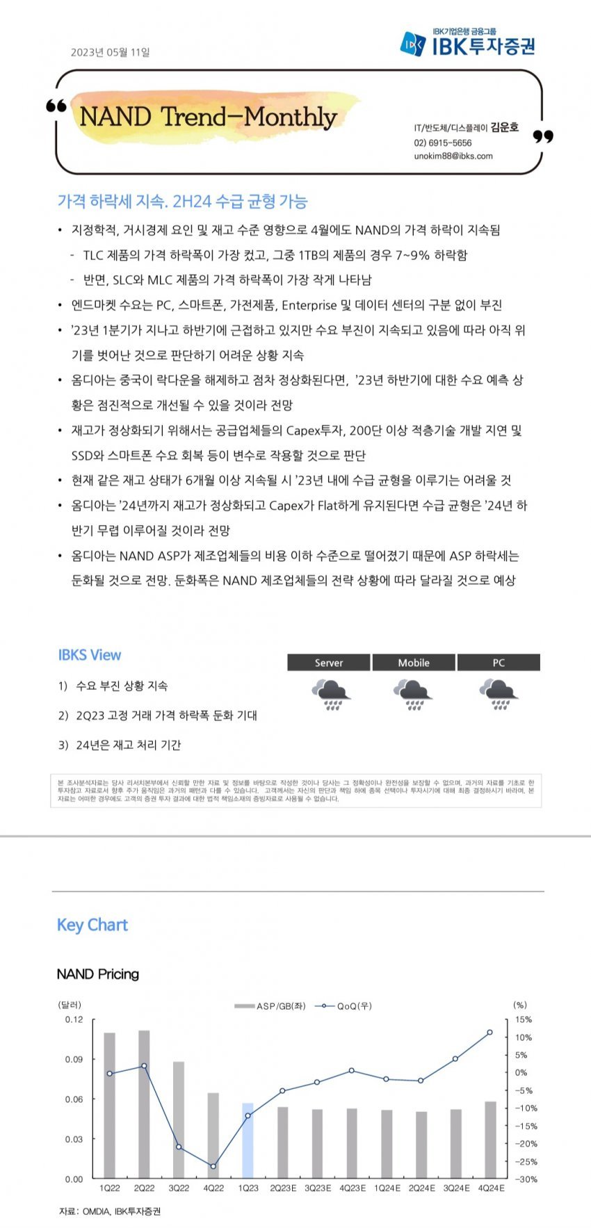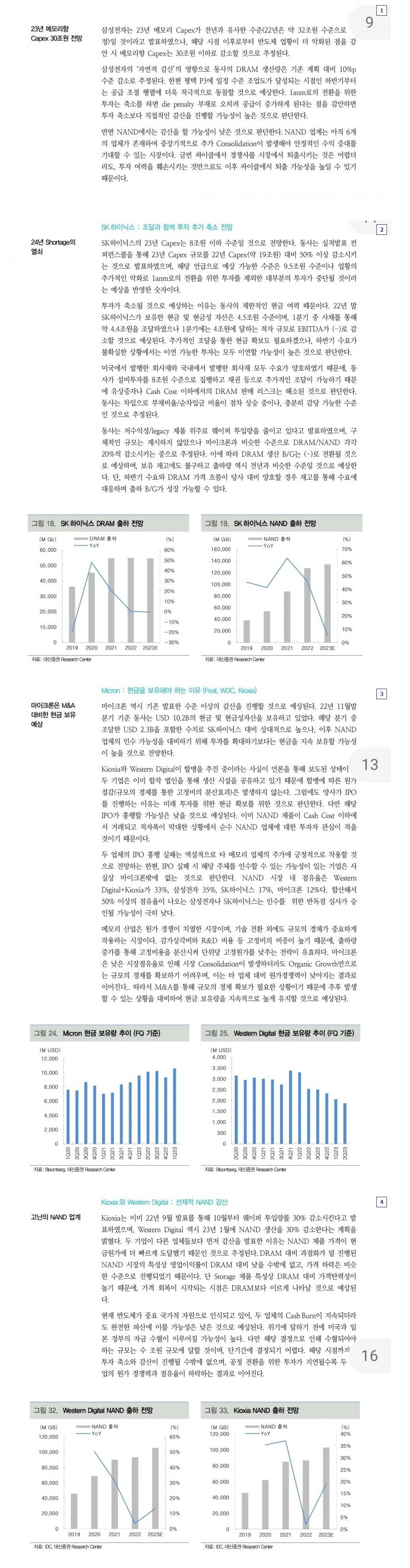이미 그동안 가격이 워낙 많이 빠졌어서 여기에서 가격이 크게 더 하락하기도 힘들지만, 그렇다고 조만간 반등하기도 어렵다고 전망함. 본격적인 낸드 가격 반등 시점은 24년 하반기부터나 가능함. 단, 그것도 업계 CAPEX가 계속 Flat하게 유지될 때에나
