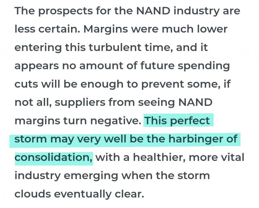 업계 전문가들은 이번 불황기에서 키옥시아와 웨스턴디지털이 몰락하고 이 두 기업은 마이크론으로 합병되어