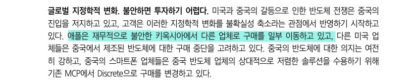 2. 향후 제품 성능과 기술 경쟁력에 대한 의문: 재무적으로 여력이 없으니 향후 연구개발과 CAPA 투자에서 뒤쳐지게 되고, 그렇게 되면 애플이 원하는 성능의 제품을 정해진 시간에 정해진 물량만큼 제때 공급하기가 어렵게 됨.