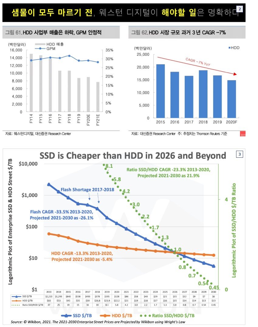 WD에게는 더 절망적인 게 HDD는 SSD의 완벽한 열등재라서 SSD 가격이 개폭락하면 개폭락할수록 사람들이 HDD를 살 이유가 전혀 없어진다는 점임. 그래서 HDD 사업 역시 올해 골로 갈 것으로 예상하고 있음. 그래서 HDD 경쟁사 씨게이트만 해도 작년 3분기 매출이 18.5억 불로 2005년 이래 역대 최악을 기록했고, 인원 3000명 해고에 들어간다고 난리가 났음.