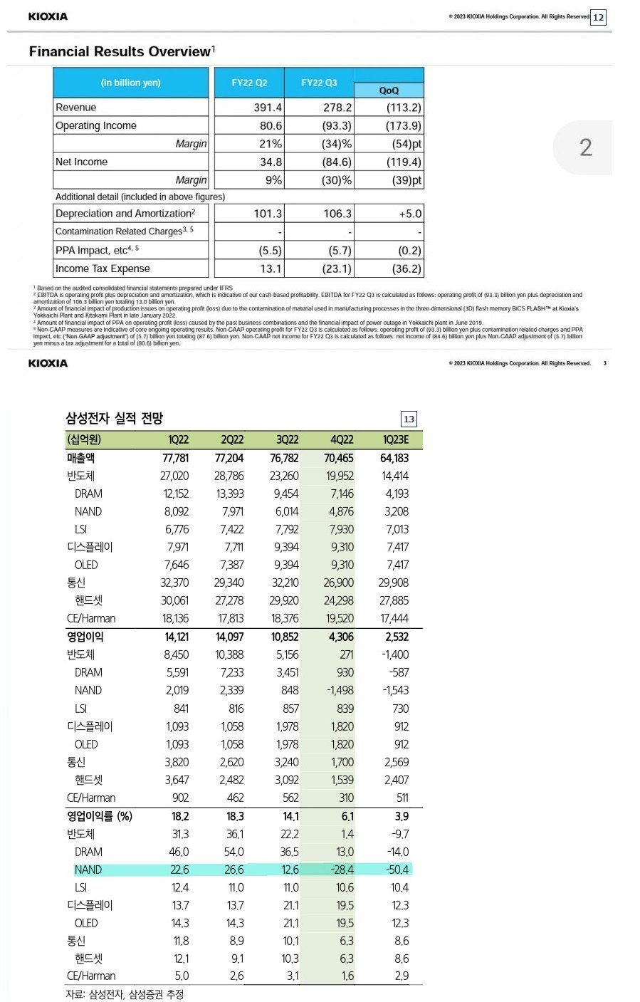 지금 같은 극심한 다운턴에서 특히 키옥시아는 내년 중에 자기자본 8조 원 다 날려먹을 가능성이 높고, 설령 살아남아도 기술력, 재무구조, 시장점유율 모두 디램 3사에 크게 뒤쳐지게 될 꺼임.