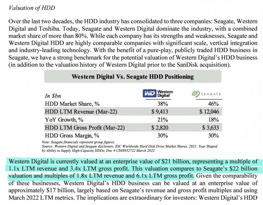 작년에 엘리엇에서 WD에 보낸 주주 서한인데 보면 재작년 기준으로 씨게이트와 WD의 HDD 시장점유율과 매출총이익률(Gross Margin %)는 거의 비슷한데, 거기에 더해 WD는 낸드 사업이 있음에도 시총이 거의 비슷함($21B vs. $22B). 그래서 엘리엇 주주 서한을 읽어 보면 "니네가 회사 경영을 개떡같이 해서 시총이 이 모양이다 이 병X들아" 이거임