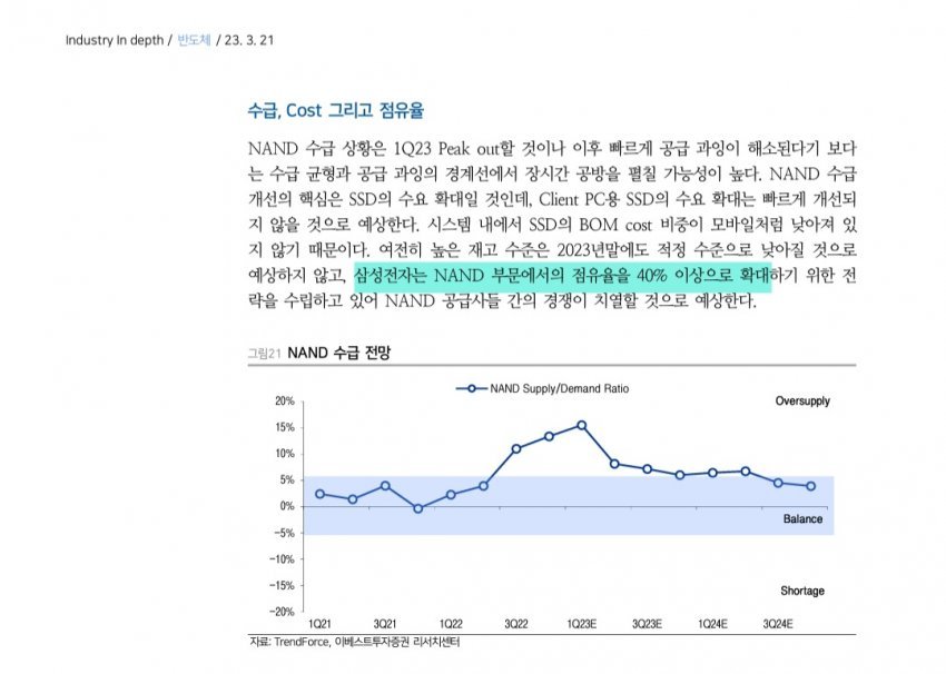 지금까지 봤던 애널리스트 리포트 중 낸드 산업의 본질을 가장 정확히 이해하고 있는 게 바로 이 리포트임. 나온지 2년 반이나 된 리포트이지만 지금도 충분히 읽어볼 만한 가치가 있는 리포트라고 생각함. 여기서 말하는 내용이 바로
