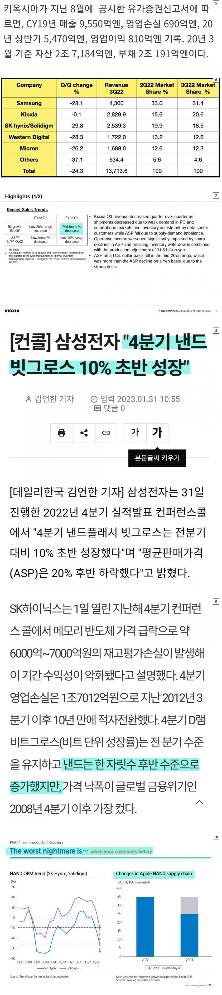 그런데 4분기에는 아이폰 14 흥행이 기대 이하라서 애플향 부품 수요가 급감했고, 이 때문에 첨부 7에 나온 키옥시아 낸드 출하량(Bit Growth: 빗그로스)가 -10%대 중반 이상 급락함. 반면 아래 기사처럼 삼성전자 등 다른 업체들은 낸드 빗그로스가 한 자리수 % 후반부터 10% 이상 증가했기 때문에 다시 키옥시아 낸드 시장점유율은 반대급부로 엄청 하락했을 것임.