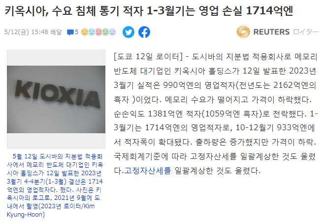 23/5/12 키옥시아는 23년도 1분기에 약 1조 7천억원 규모의 영업손실을 발표함
