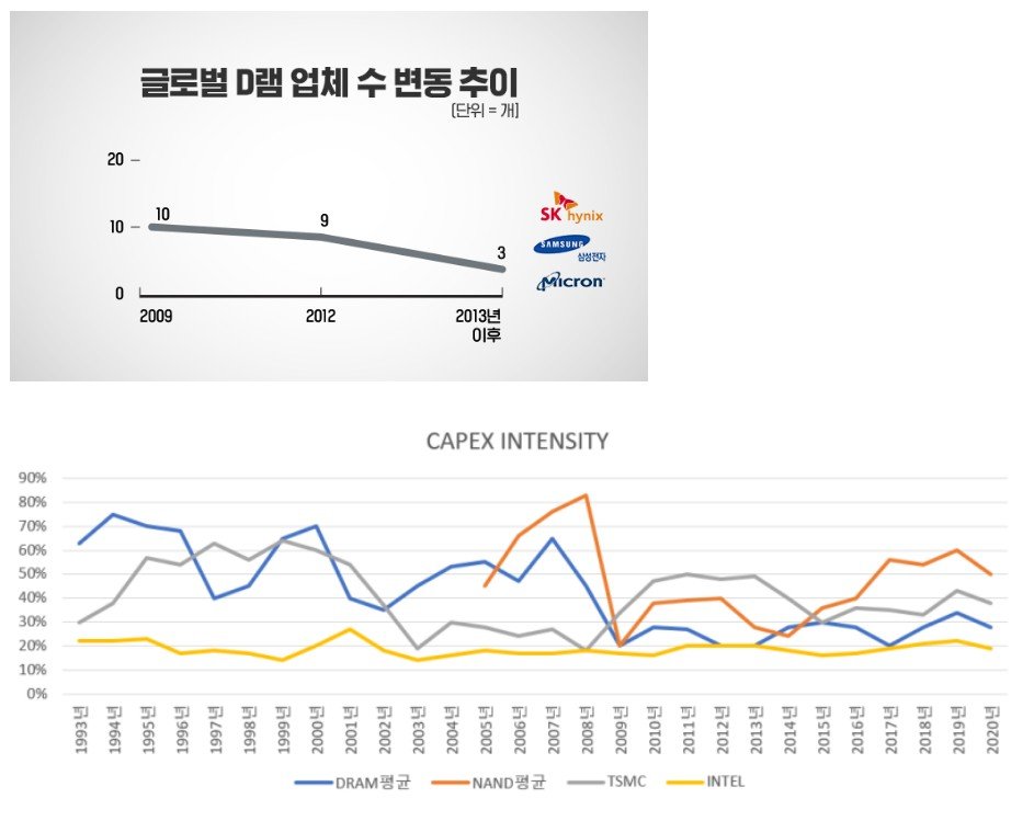 1. D램의 CAPEX Intensity는 치킨게임으로 업계 통폐합이 진행되면서 지속적으로 하락해 왔음. D램은 이제 아주 좋은 캐쉬카우다. 평균 영업이익률도 높고 투자를 덜 해도 되니까.