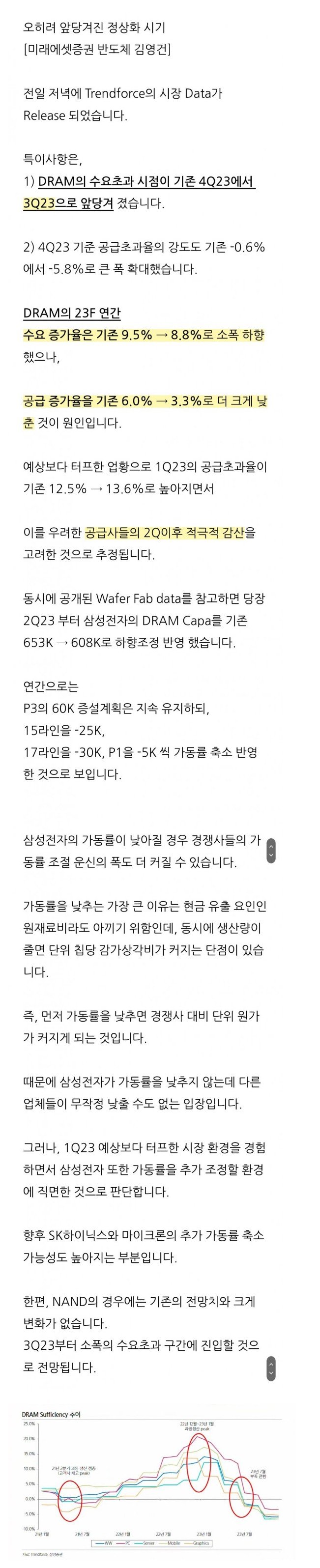 그 이유가 뭐냐면 디램 가격이 더더욱 심하게 폭락할수록 심지어 삼성전자마저도 디램 감산에 더더욱 적극적으로 나설 수밖에 없고, 때문에 공급이 훨씬 더 많이 감소하게 되어 디램 가격 반등 시점도 빨라진다는 것임. 즉, 하락 사이클이 깊어지는 만큼 그 기간이 짧아지게 됨. 첨부한 미래에셋 리포트도 그것을 지적하는 것이지. 또 23년 연말까지도 디램 재고 다 소진 못하는 건 모두 다 알지. 그런데 이렇게 공급을 줄여 대면 24년에는 어떻게 할 건데? 24년 중 재고가 다 소진되면 그때는 반대로 극심한 숏티지가 올 건데? 시장은 그것을 알아차리고 디램 가격이 미리 반등하기 시작하는 것임.