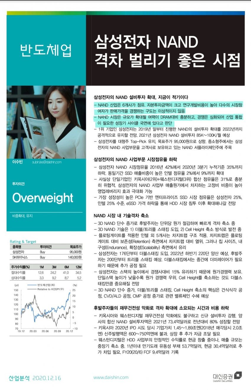 - NAND 시장은 규모가 확대될 여력이 DRAM 대비 충분하고, 경쟁은 심화되어 산업 통합이 필요한 성장기 사이클 국면에 있다고 판단