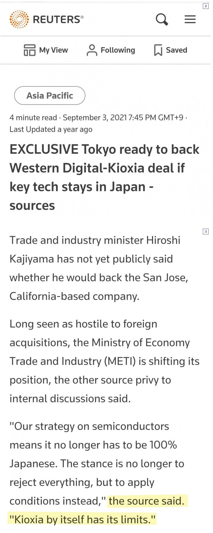 일본 정부 관계자가 위 로이터와의 인터뷰에서 "키옥시아는 한계가 있다(Kioxia by itself has its limits)"라고 한 것도 바로 그 때문. 대신 일본 정부는 반도체 생산 라인을 해외로 이전하지 않고 일본에 놔두는 조건(키옥시아/WD는 생산 라인이 전부 일본에 있음)으로 인수를 허용 했었으나, 독과점 방지법을 들먹이며 인수를 반대한 중국 정부로 인해 끝내 딜이 무산된 것으로 알고 있음.