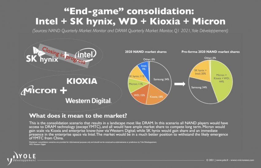 통폐합 과정에서 일본 정부는 위에서 소개 했듯 결국 키옥시아와 WD의 합병을 승인할 것이고 추후 미국도 마이크론이 키옥시아/WD를 인수해서 미국 기업이 낸드 점유율을 늘리니 만족스럽고, 또 중국의 YMTC가 진입하기 어렵도록 낸드에서도 3사 독과점 구조가 구축되기 때문에 이 역시 만족스러울 수밖에 없음. 이건 위 자료에 나온 시장조사기관 Yole도 같이 이야기하는 내용임 (The market would be in a much better position to withstand the likely emergence of YMTC from China)
