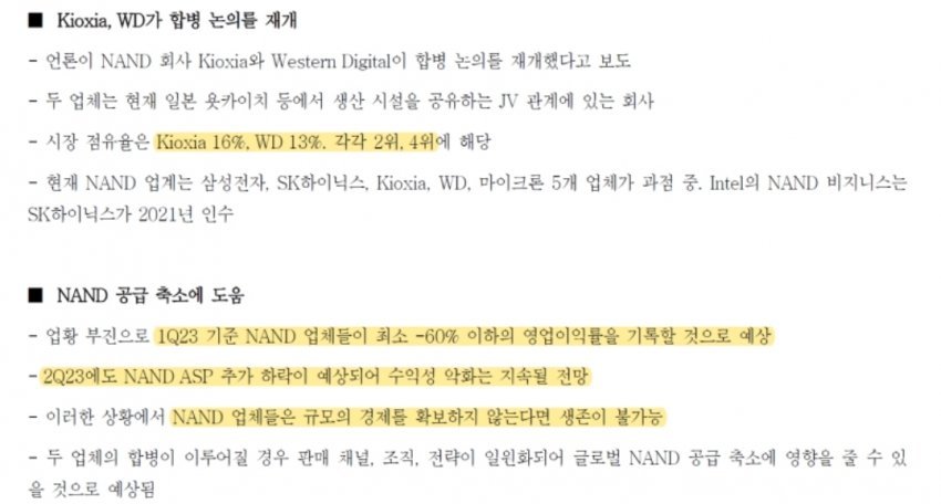 17-18년도 슈퍼사이클 당시 삼성-하닉의 D램 영업이익률은 최대 60%를 상회했는데 낸드는 불과 15~20% 수준이었음. 통폐합하면 낸드도 D램 시장처럼 되는 거지.