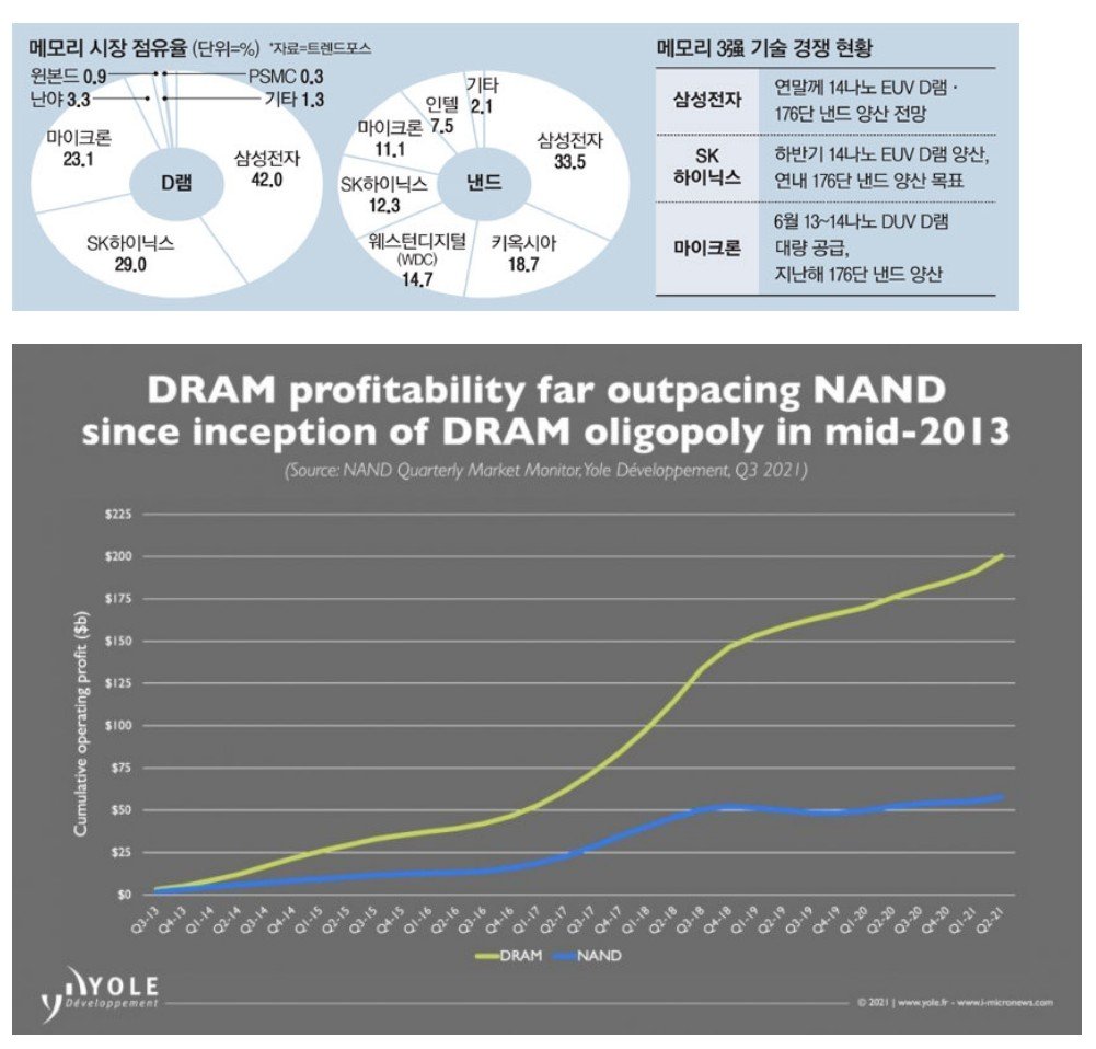 즉 위 두 표에서 보다시피 D램은 빅3 체제로 개편되어 3사 모두 안정적으로 큰 수익을 벌어들이고 있는 반면