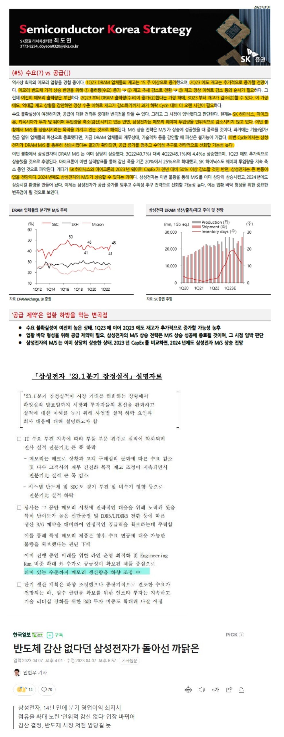 그렇게 보면 삼전은 D램에서 격차가 계속 좁혀지는 상황에서 이번 다운턴이야말로 경쟁사들에 재무적인 타격을 가해서 기술 격차를 조금이나마 더 벌리고, 또 시장점유율을 조금이나마 더 뺏어오는 기회로 활용하고자 했음. 치킨게임으로 누구를 죽여버리거나 아예 도태시켜 버리겠다와는 다름. 그렇게 해서 내 생각에 이번 다운턴에서 삼전은 작년 말 40%대 초반까지 하락했던 D램 시장점유율을 40%대 중후반까지 끌어올리고, 또 공정세대에서 0.5세대 정도 격차를 벌이는 데는 성공한 것 같음. 그런데 그 이상은 삼전도 더 격차를 벌이기는 어려움. 어차피 경쟁사 퇴출도 힘들고, 격차가 별로 없다 보니 삼전도 그만큼 다운턴에서 돈을 많이 써야만 하거든. 또 올해 상반기에 D램 수요가 예상했던 것보다 훨씬 더 안 좋아서 삼전이 예상했던 것보다도 메모리 부문에서 적자가 훨씬 더 커지는 상황임. D램은 이 정도 했으면 삼전도 만족할 것 같음. 다시 수익성 위주 경영으로 복귀하는 것이지. 즉, 삼전도 감산에 동참함으로서 D램 수요공급 Balance 시점을 앞당기는 것임.