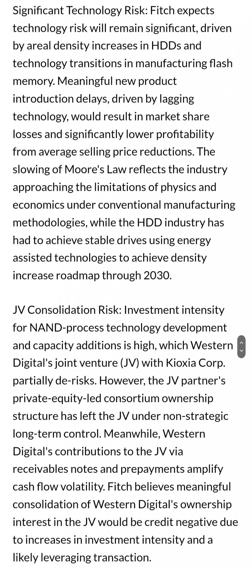 JV 통합 위험 : WDC가 키옥시아와 낸드 사업을 합작법인(JV)으로 운영해서 리스크를 분담함에도, 낸드 사업은 공정기술 개발을 위한 투자 강도가 매우 높다. 하지만 JV 파트너인 키옥시아의 사모펀드 주도의 컨소시엄 소유 구조는 회사의 장기적인 경영전략 수립을 어렵게 한다. 또한 WDC가 낸드 사업에 지불하는 돈은 현금흐름 변동성을 크게 높인다. Fitch는 WDC의 키옥시아 인수는 투자 강도와 부채비율 증가 때문에 신용도에 부정적일 것으로 보고 있다.