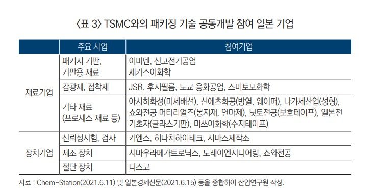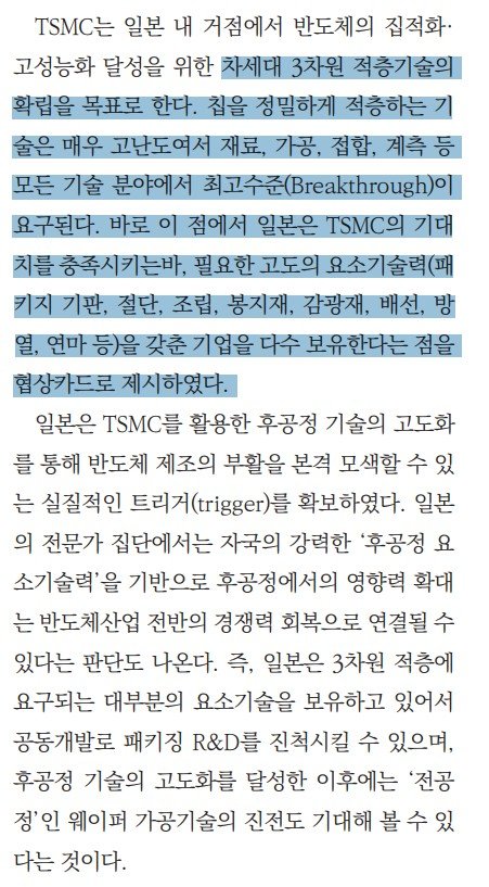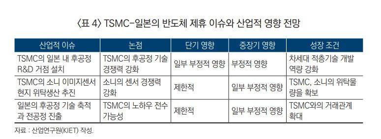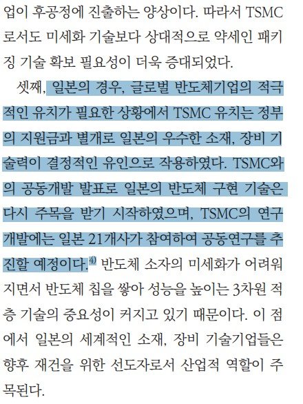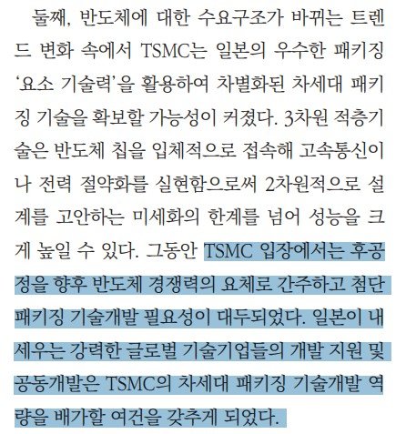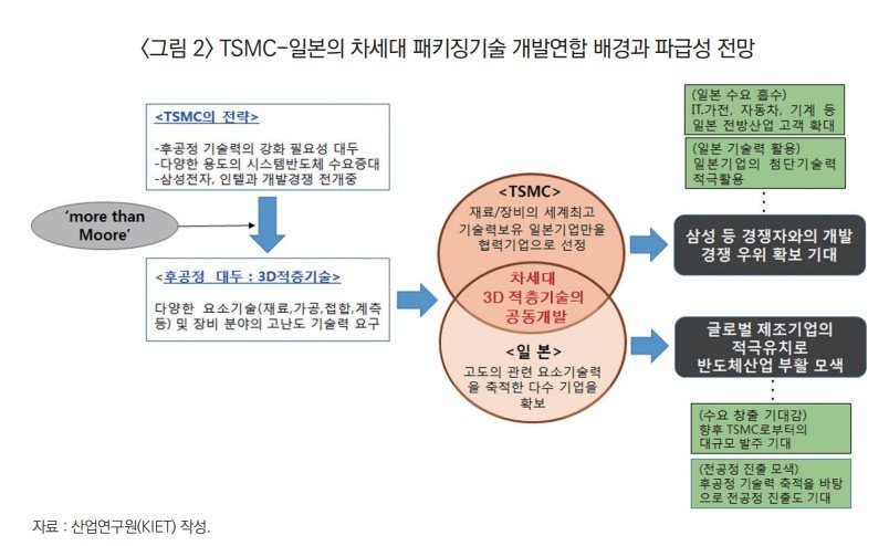 그래서 당시 산업연구원 측에서도 TSMC와 일본의 협력으로 인해 발생할 산업화 이슈 중 국내 산업계에 가장 부정적인 영향을 끼칠 이슈로 'TSMC의 후공정 기술 경쟁력 강화'를 꼽고 있음