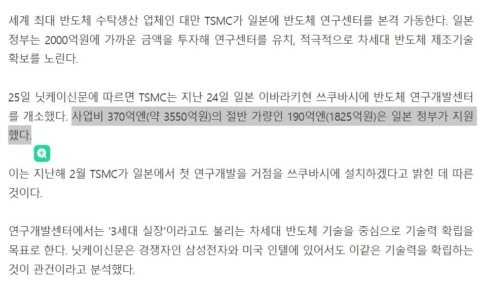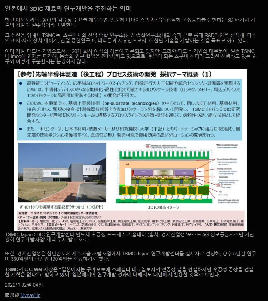 그리고 실은 이것도 경쟁사인 TSMC에 비해 많이 늦은거임. TSMC는 이미 21년도에 일본 후공정-소부장 기업들과 R&D 협력을 통해 패키징 기술개발을 할려고 일본 투자를 결정했음.