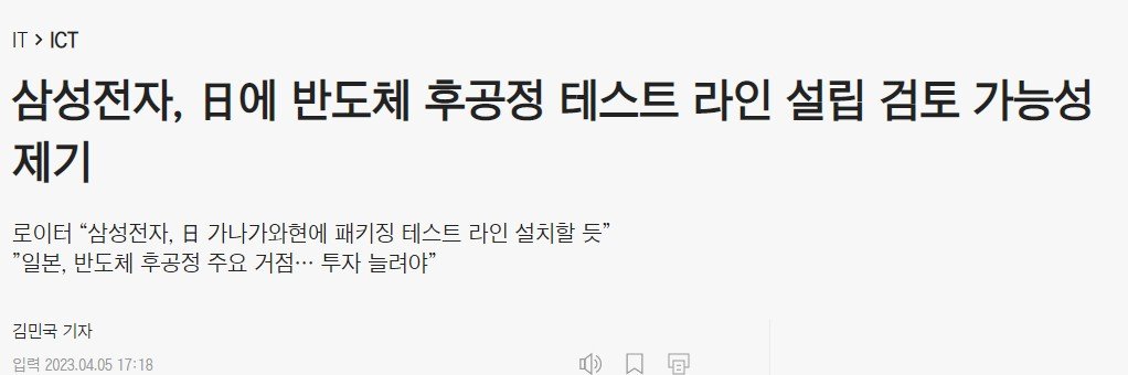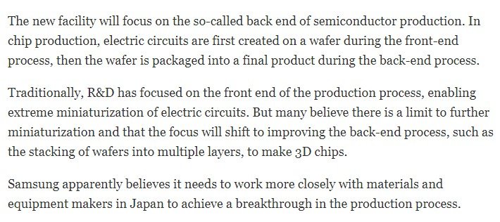 실은 3-4월 중부터 삼성이 일본 가나가와현에 반도체 패키징 (후공정) 테스트 라인을 건설을 검토중이라는 썰이 국내에서도 계속 흘러나왔고 어제자 공식적으로 나온 Nikkei발 기사에도 새로운 시설은 백엔드 (so-called back end of semiconductor production, 후공정) 관련 시설이라고 나왔음