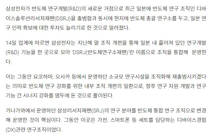 그래서 삼성은 최근 기존 일본에 산재되어있던 연구조직과 시설을 재편해서 일본내 반도체 연구를 총괄하는 DSRJ를 출범시킴
