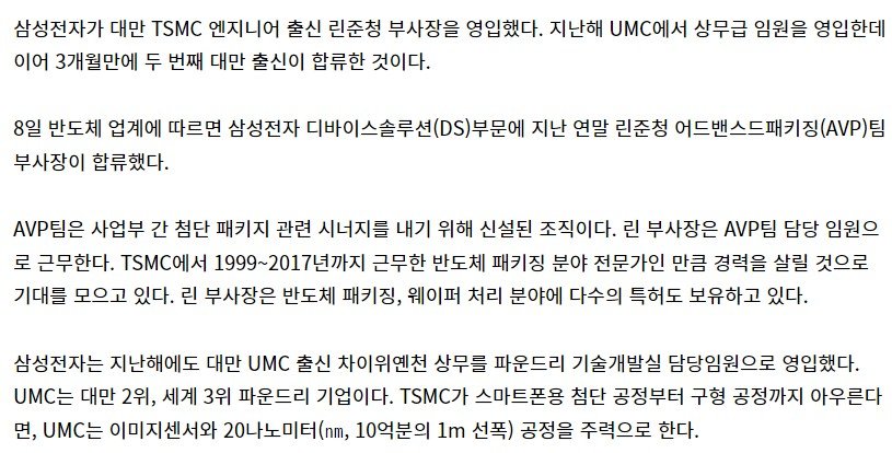 그 외 TSMC로부터 패키징 전문가를 영입하기도 하는 등 파운드리 사업부 전체가 패키징 기술력 확보에 열을 올리는 모습인듯 함