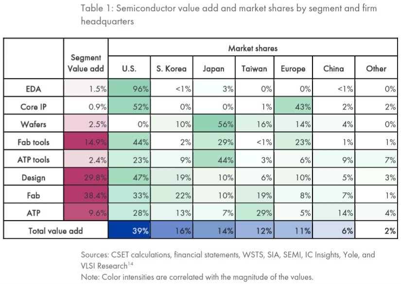 이건 조지타운 대학교 산하 싱크탱크인 CSET(안보신기술센터)에서 만든 반도체 밸류 체인의 국가별 경쟁력 평가임. 좀 더 설명하자면 반도체 산업의 최전방(EDA: 반도체 설계 도구)부터 최후방(ATP: 후공정)까지의 전체 밸류 체인에서 각 국가별 점유율과 밸류 체인별 가치를 나타낸 자료임.