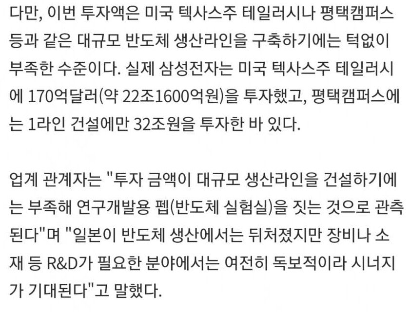 당시 연구시설 투자규모도 딱 한화 3500억 원 수준임. 오늘 발표된 삼성전자 일본 투자액과 딱 일치하지?