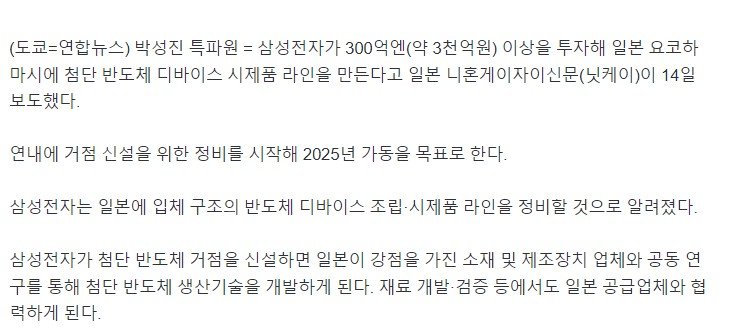 오늘 뜬 기사임. 대략 일본 가나가와현 요코하마시에 3천억 규모의 반도체 시설 투자를 한다는 보도가 나왔는데