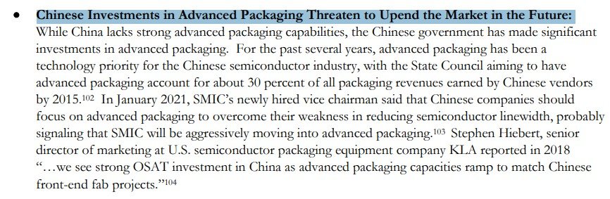 2021년 1월에 새로 영입된 SMIC의 부회장은 중국 기업들이 반도체 선폭 감소에 대한 약점을 극복하기 위해 첨단 패키징에 집중해야 한다고 말했는데, 이는 아마도 SMIC가 첨단 패키징에 적극적으로 진출할 것이라는 신호일 것입니다.103 미국 반도체 패키징 장비 회사 KLA의 마케팅 수석 이사 스티븐 히버트는 2018년에 다음과 같이 보고했습니다.
