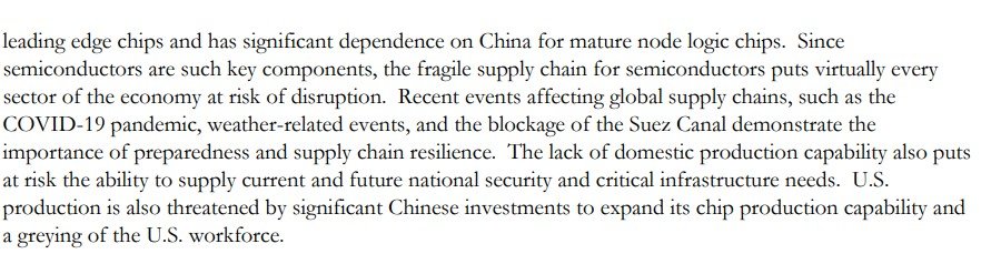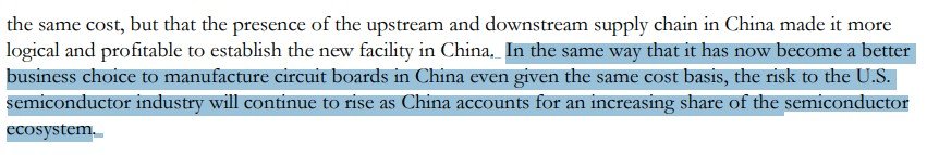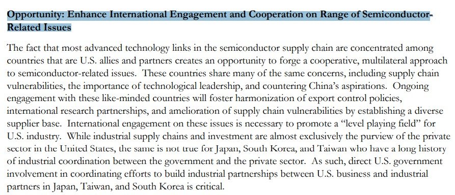 이 보고서의 반도체 파트를 읽어보면 전반적으로 중국을 조져야한다. 라는 논조가 여실히 드러남. 반도체 생태계를 차지하는 한국, 일본, 대만, 유럽 부분 설명과는 완전 딴판임. 중국에 대한 묘사에서는 유독 threat(위협) risk(위험) 등의 표현이 많음. 사실 이런 표현은 중국말고는 거의 안나옴. 약간 눈이 뒤집힌거 같은 느낌도 있음.