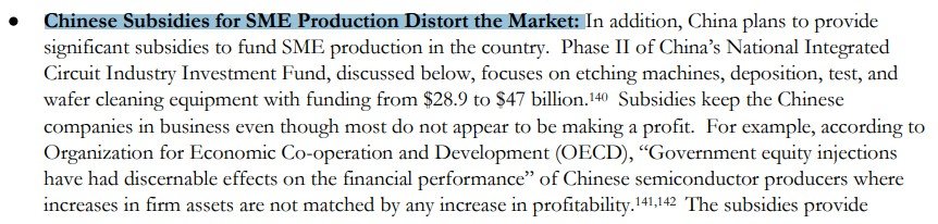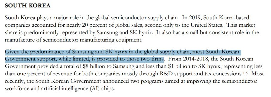 (※ 이게 무슨 의미이냐면 무한 보조금 놀이하며 시장교란하는 중국과는 달리, 삼성과 SK하이닉스에 대한 한국 정부의 지원은 이들 매출의 1%미만으로 즉 아주 적은 수준으로 지원되고 있다는 의미임. 즉 상무부가 보기에 한국은 반도체분야에서 불공정한 경쟁이나 시장교란을 하진 않는다는 것)