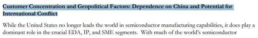 특히 장비 공급업체와 EDA 공급업체는 미국과 중국 간의 무역 제한으로 인해 상당한 영향을 받을 가능성이 있으며, 매출의 상당 부분이 장기적인 중단의 위험에 처해 있습니다. 반도체 산업에 대한 중국 정부의 야망을 고려할 때 이러한 수익원은 장기적으로 위험에 처할 수 있지만, 비즈니스에 대한 재투자 능력이 중국으로의 판매에 즉시 의존한다는 점을 고려할 때 장기적인 생존 가능성은 다음과 같습니다.
