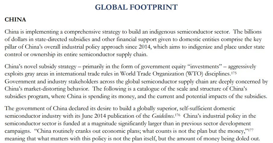 (※ 너무 길어서 중간에 자름. 대충 중국이 반도체 산업에 대한 수많은 보조금 정책(대략 추산하기로 한화 200조원)시행하는데 그 와중에 WTO 감독 및 법규 위반 회피하고 한국, 대만에서 인재 빼가고 별의 별 짓을 다 써가며 시장 교란 한다는 내용. 거의 보고서의 절반이 중국 욕이네)
