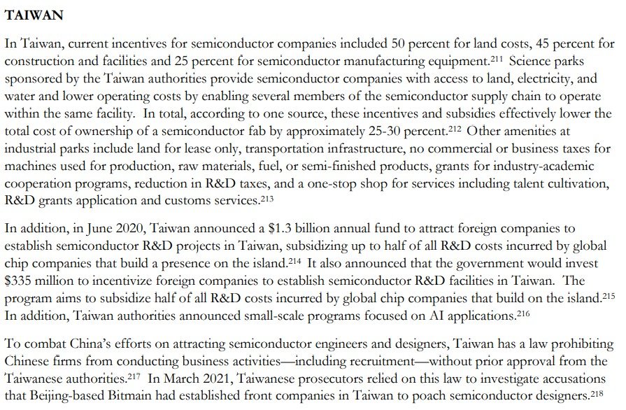 또한 2020년 6월 대만은 외국 기업의 대만 내 반도체 R&D 프로젝트 유치를 위해 연간 13억 달러 규모의 펀드를 조성하여 대만에 진출한 글로벌 칩 기업이 발생하는 모든 R&D 비용의 최대 절반을 보조한다고 발표했습니다.214 또한 정부는 외국 기업의 대만 내 반도체 R&D 시설 설립을 장려하기 위해 3억 3,500만 달러를 투자할 것이라고 발표했습니다. 이