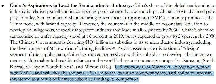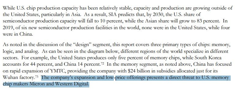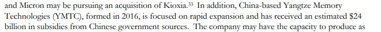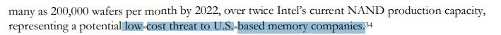 (※ 보다시피 낸드 시장의 50% 이상을 점유하는 한국 기업에 대한 언급은 전혀 없고 당시 3% 미만의 점유율을 가지던 YMTC만 콕 찝어서 마이크론과 WD에 대한 직접적인 위협이라고 명시하고 있음, direct threat to U.S. memory chip makers Micron and Western Digital.)