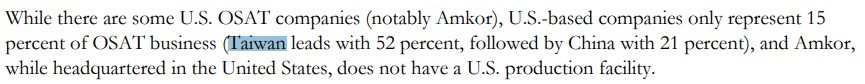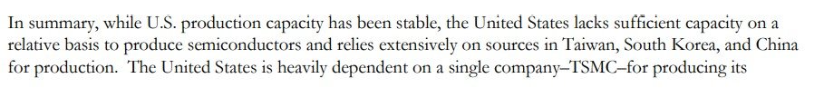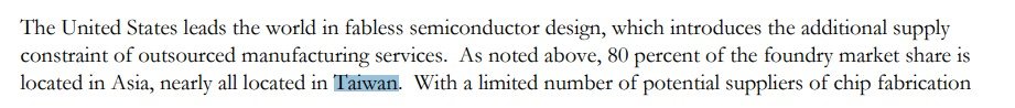 미국의 대만에 대한 시각은 무관심한 한국, 일본과는 좀 다른데 중국처럼 적대적이지는 않지만 좀 불안해하는 느낌임. 전체적으로 대만(TSMC)의 의존도를 탈피해야 된다라는 논조